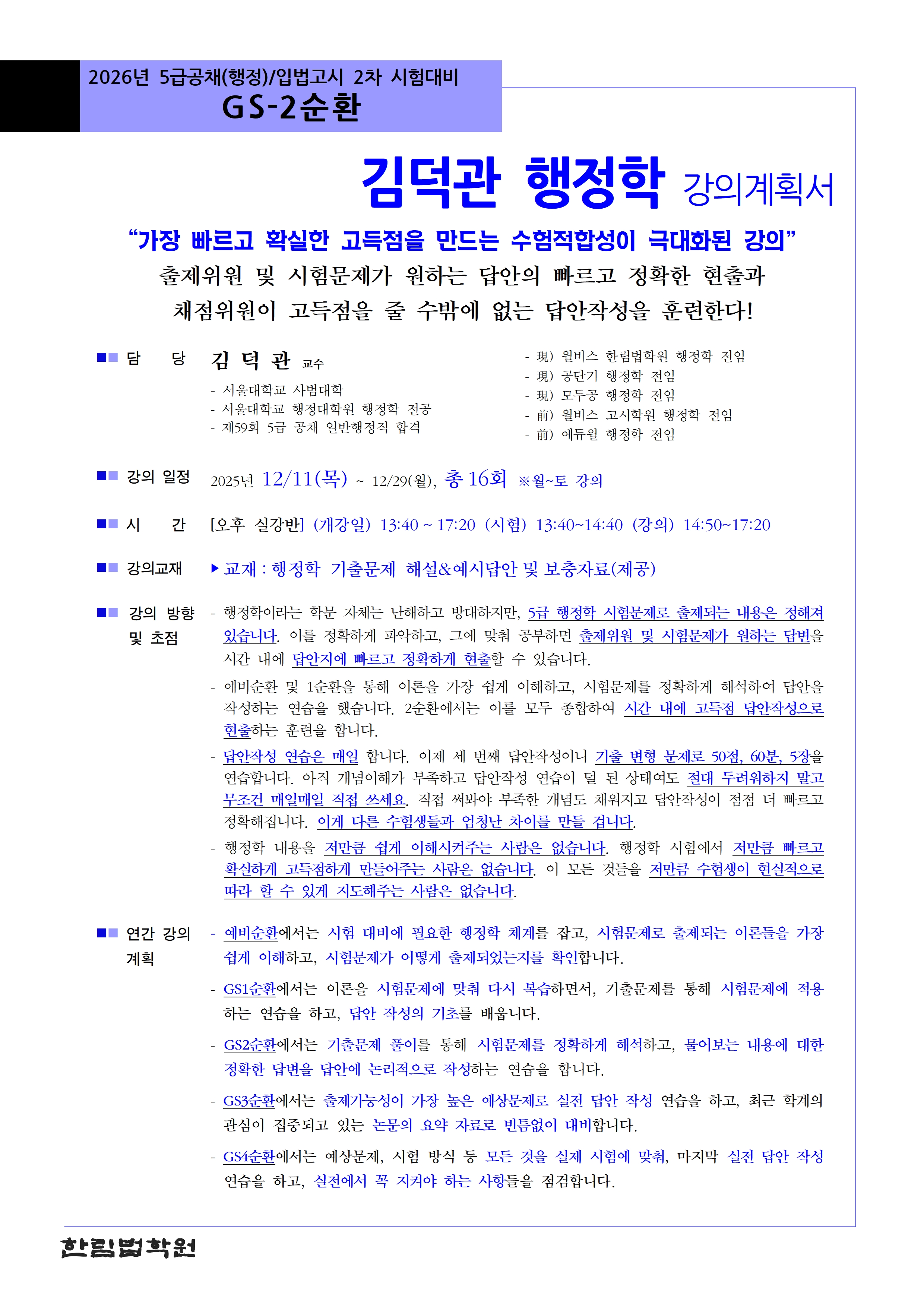 [2026년대비] 김덕관 행정학 GS-2순환(12/11,목_개강)