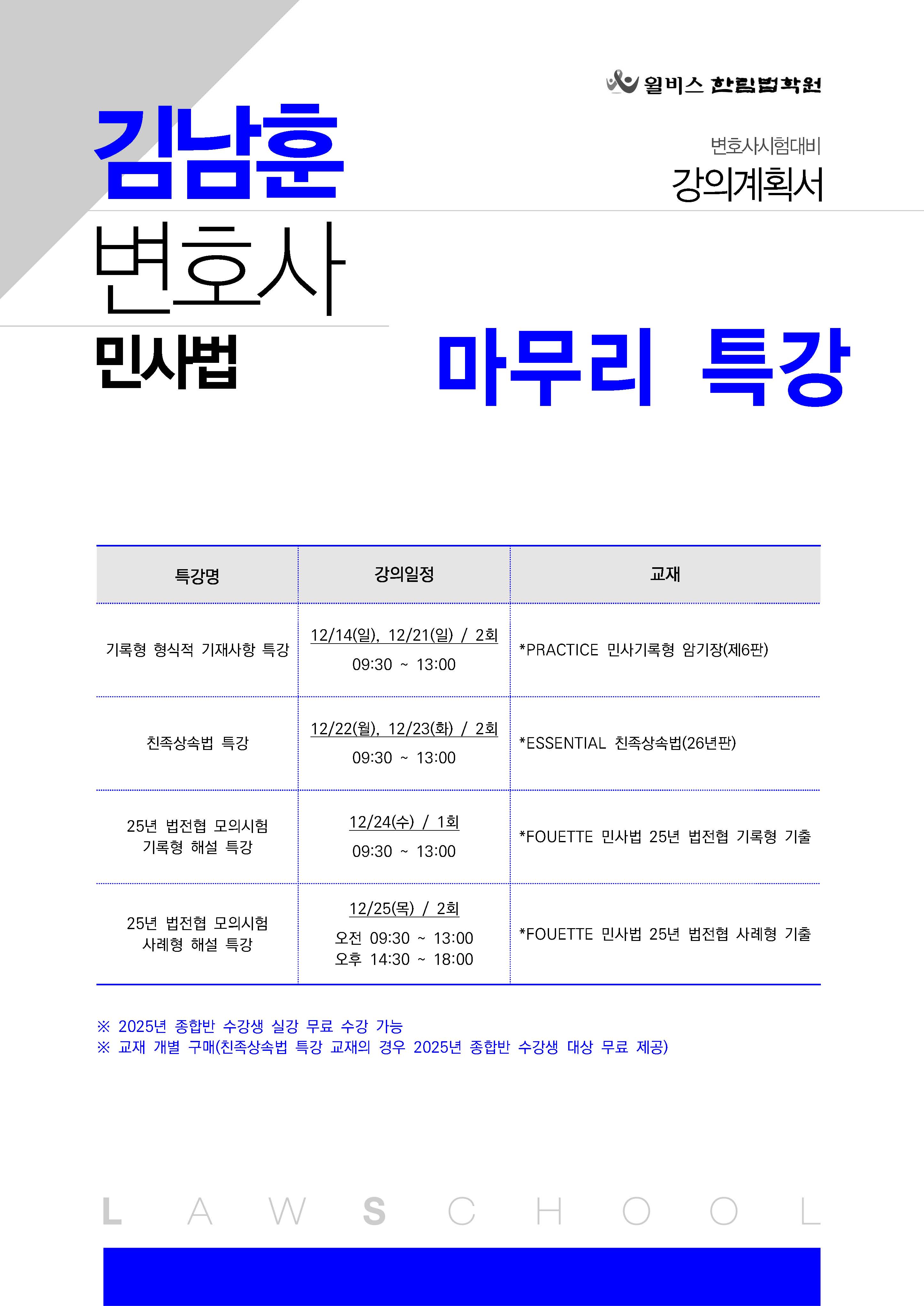 [특강] 김남훈 변호사 민사법 마무리 특강 4종(12/14, 일)