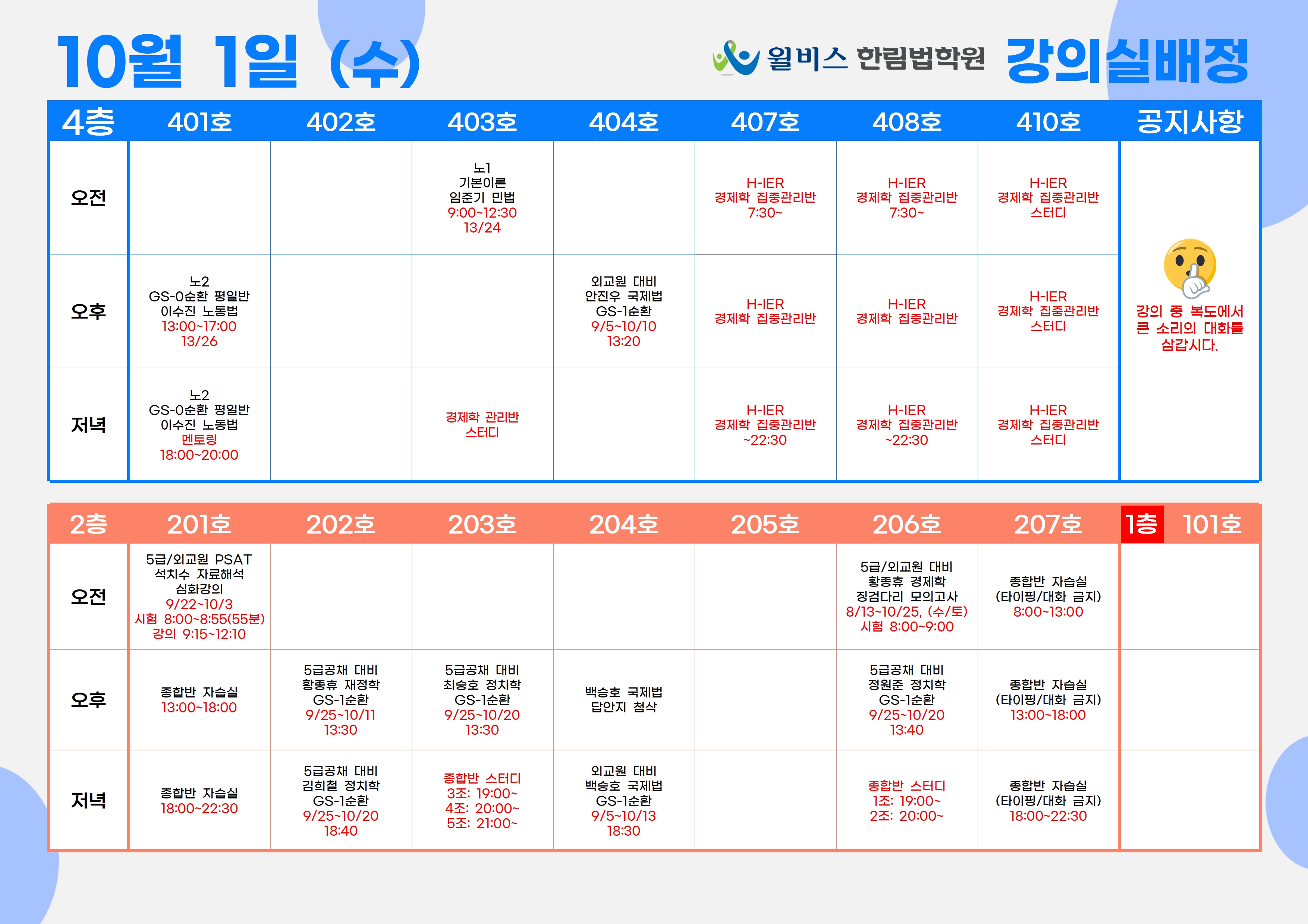 10월 1일(수) 강의실 배정표
