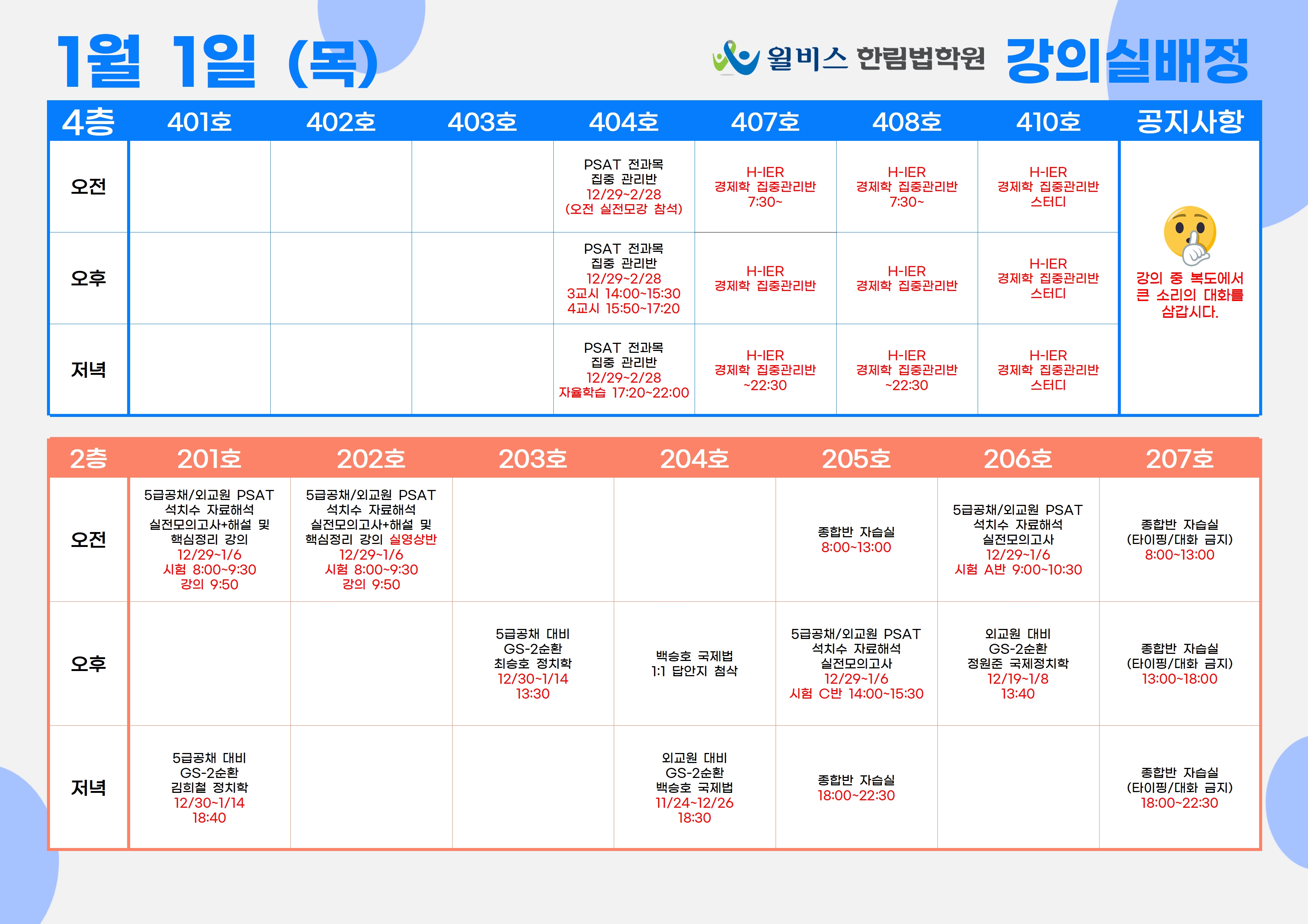 1월 1일(목) 강의실 배정표