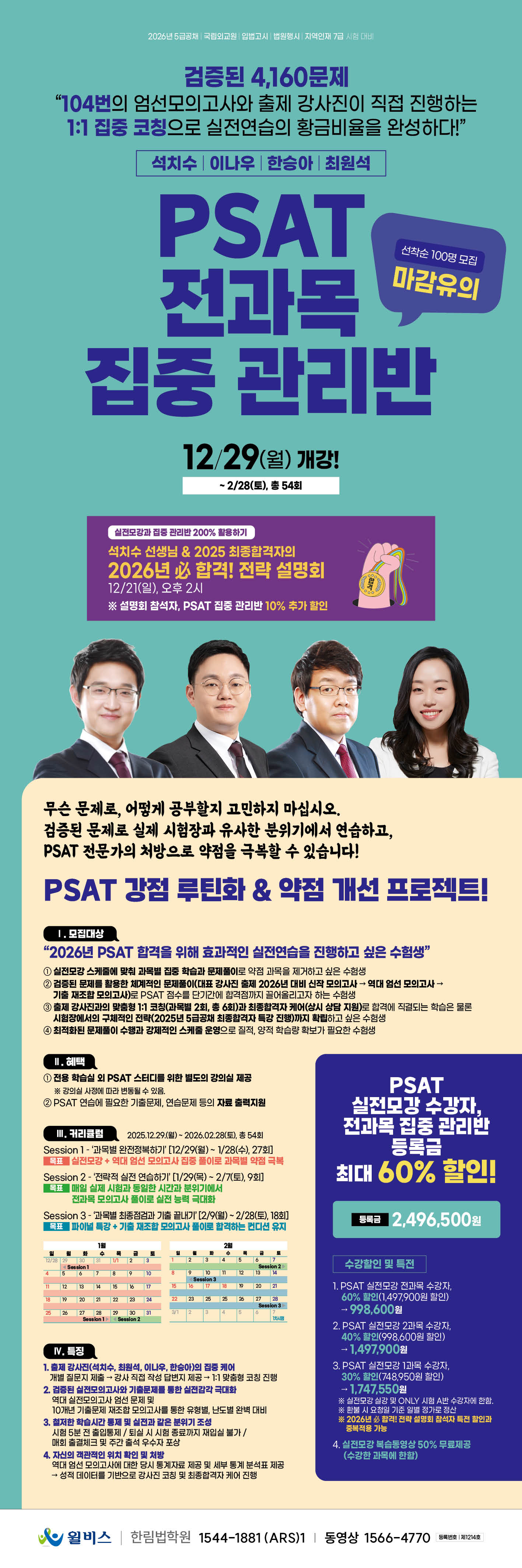 ★마감유의★ [2026년대비] PSAT 전과목 집중 관리반(12/29,월_개강)