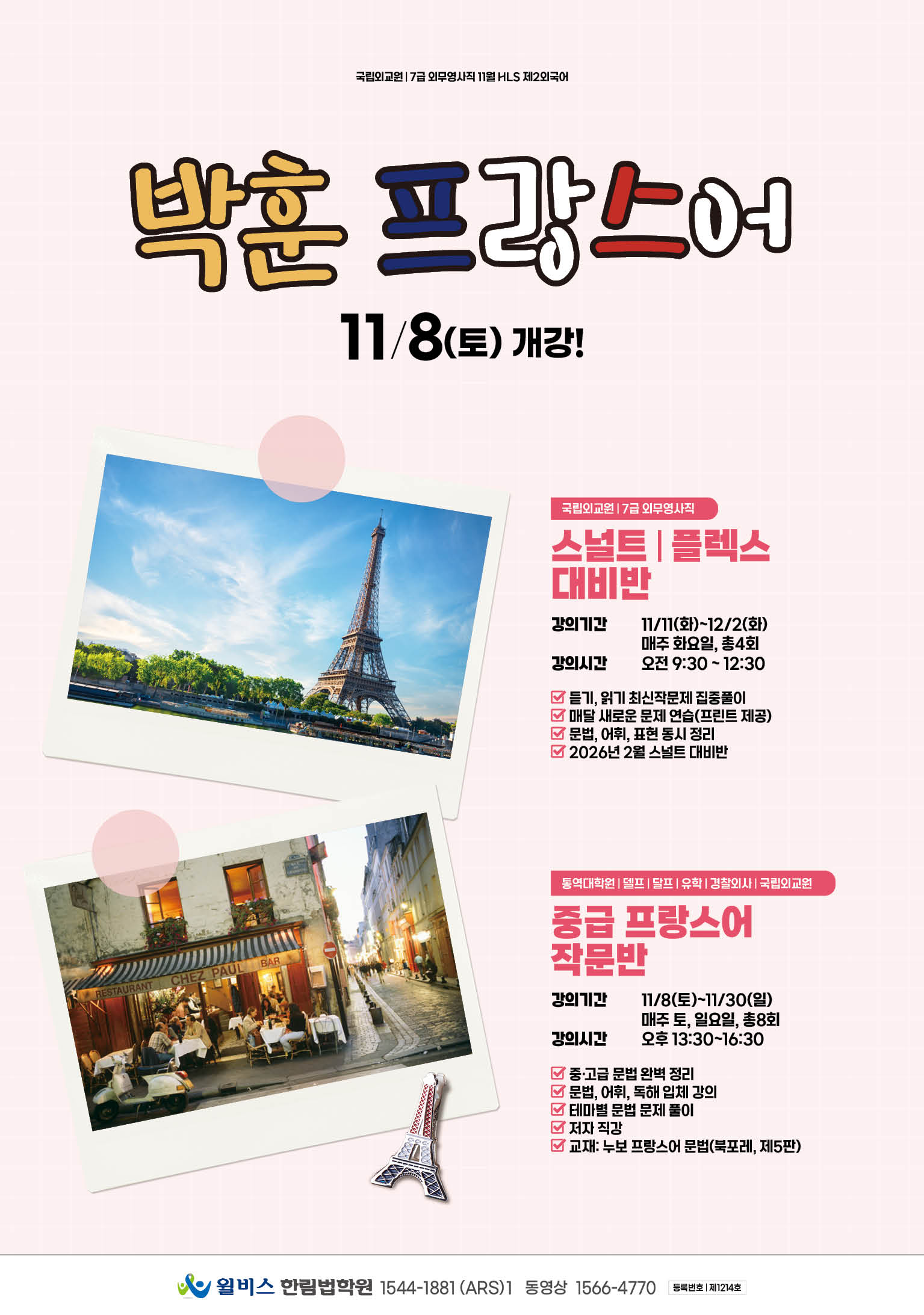 [국립외교원/7급 외무영사직] 박훈 프랑스어 2025년 11월 강의 일정