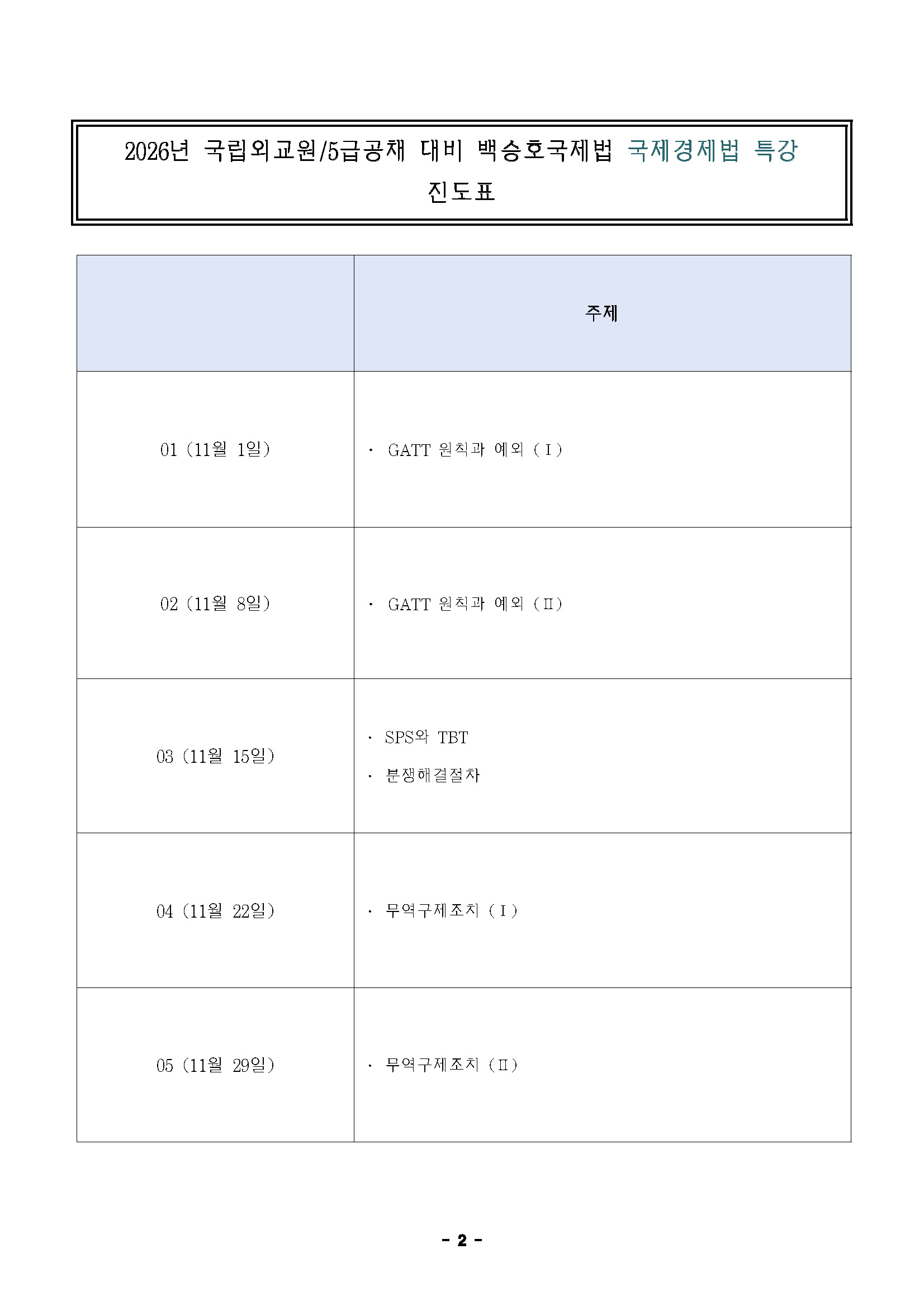 한림 백승호국제법 행외시 2026년 대비 국제경제법 특강 계획표&진도표.pdf