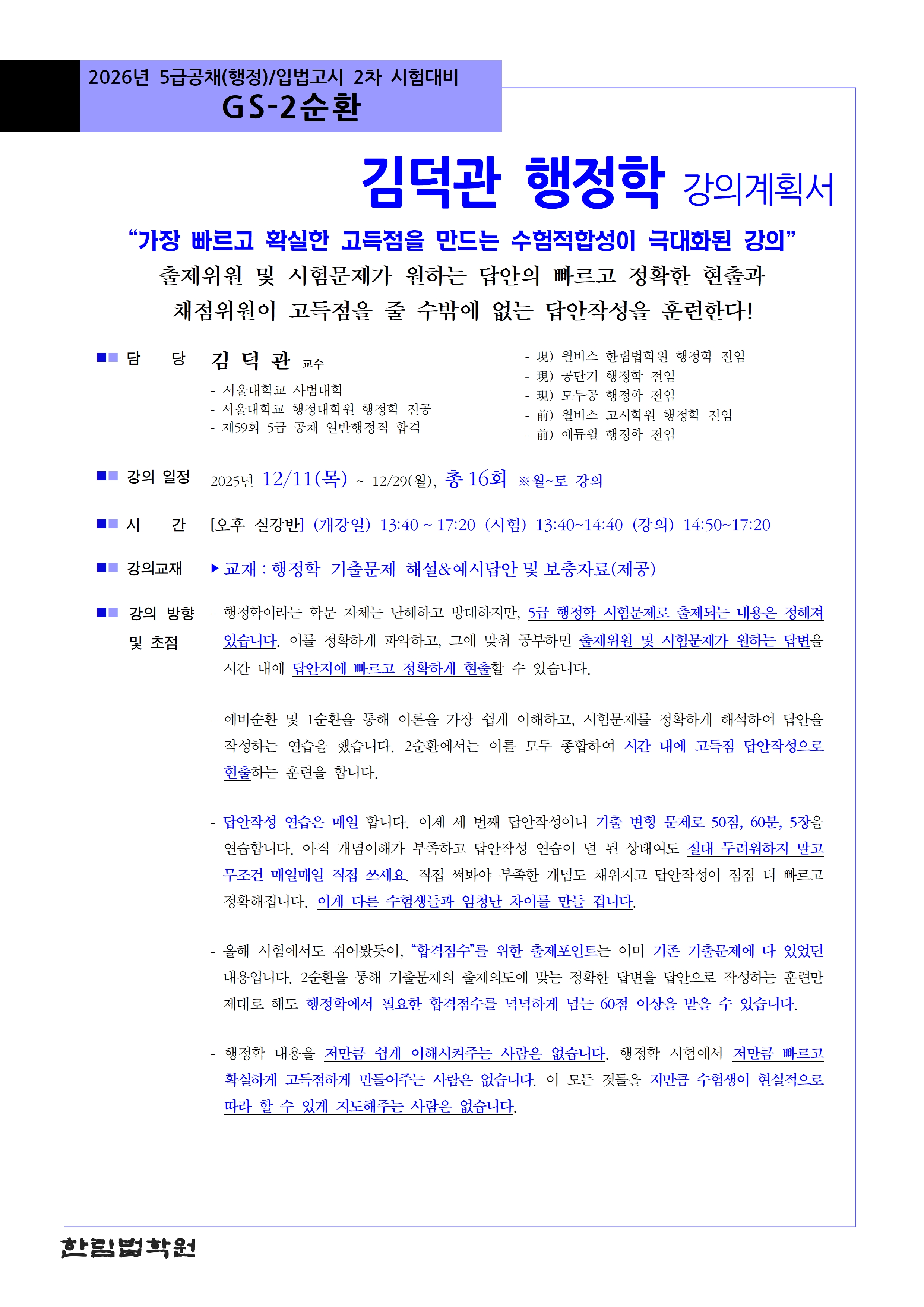 [2026년대비] 김덕관 행정학 GS-2순환(12/11,목_개강)