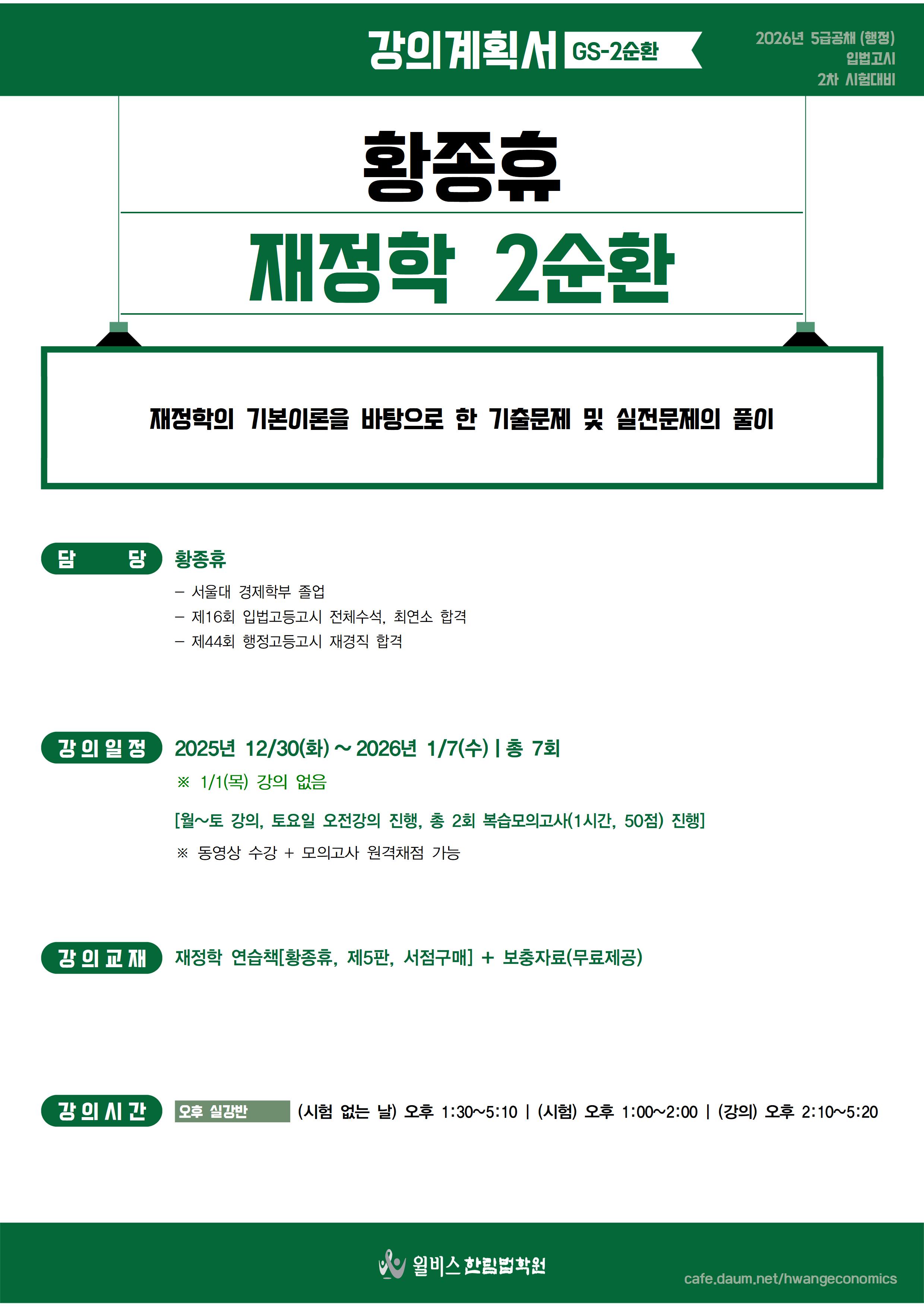 [2026년대비] 황종휴 재정학 GS-2순환(12/30,화_개강)