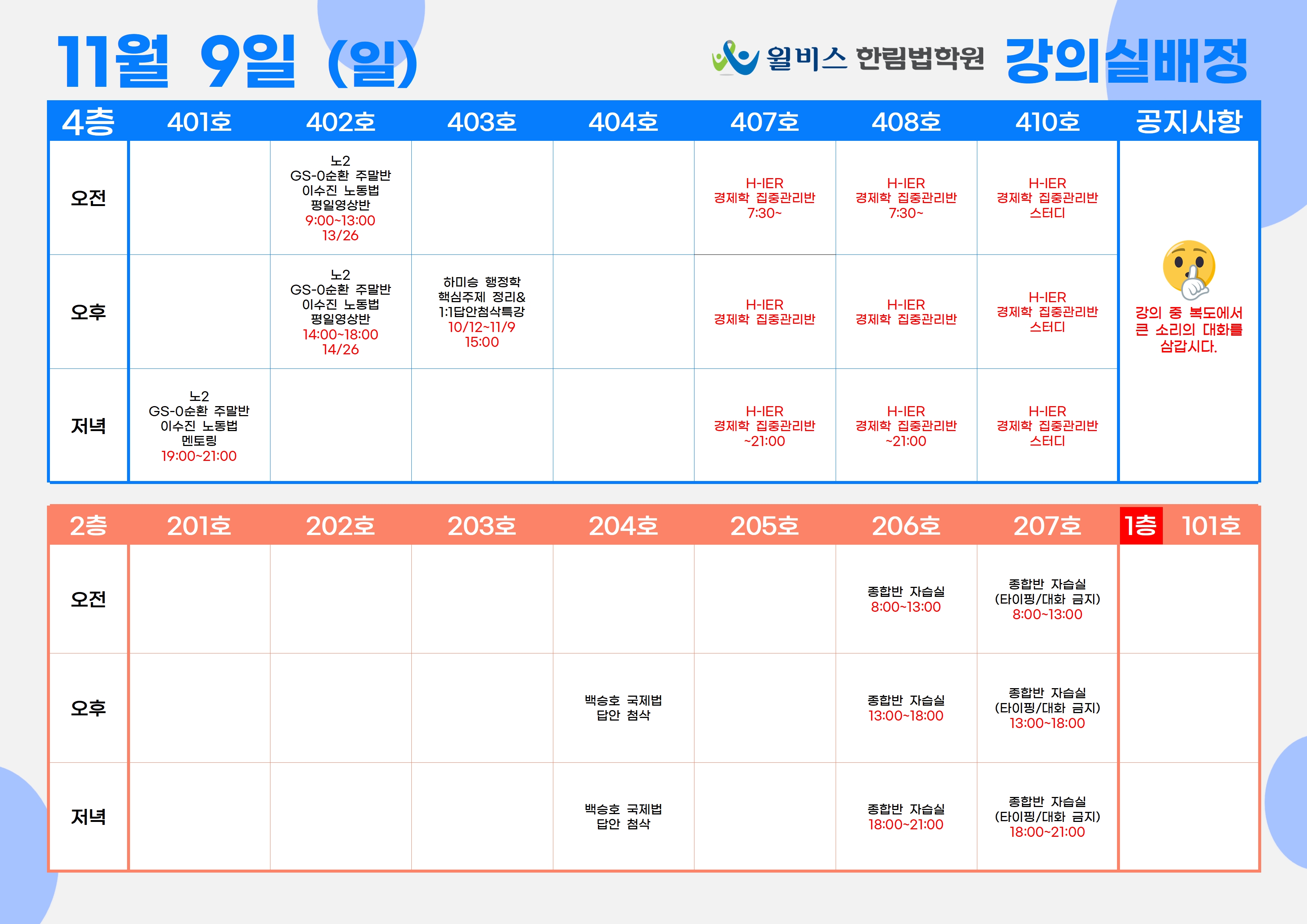 11월 9일(일) 강의실 배정표