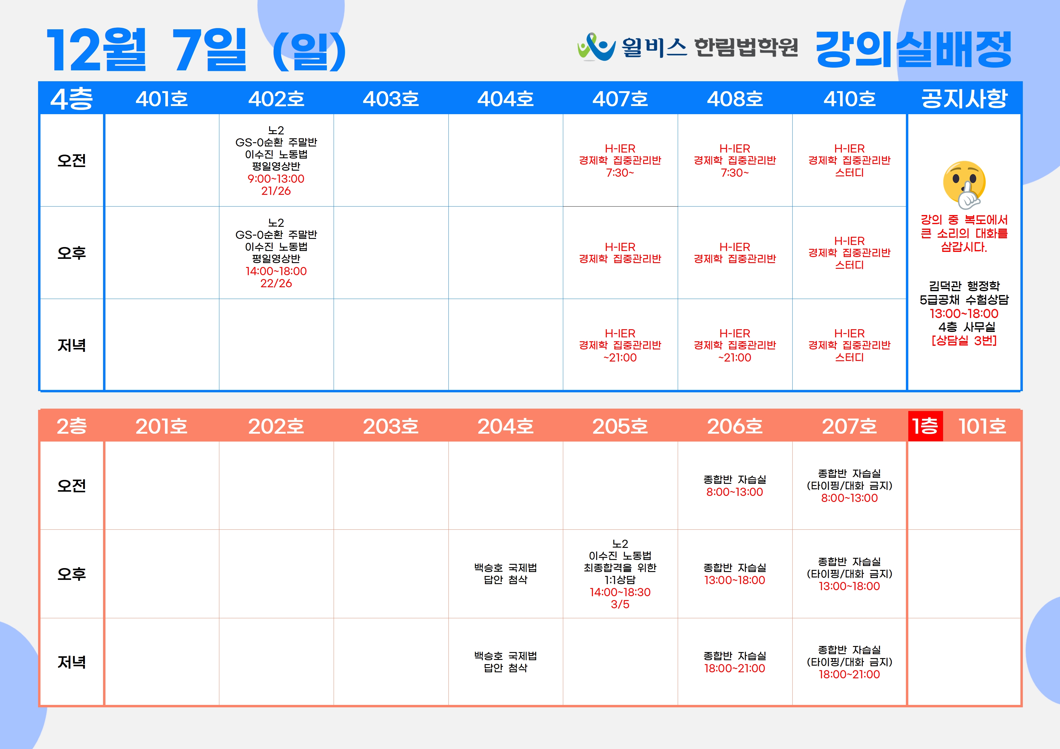 12월 7일(일) 강의실 배정표