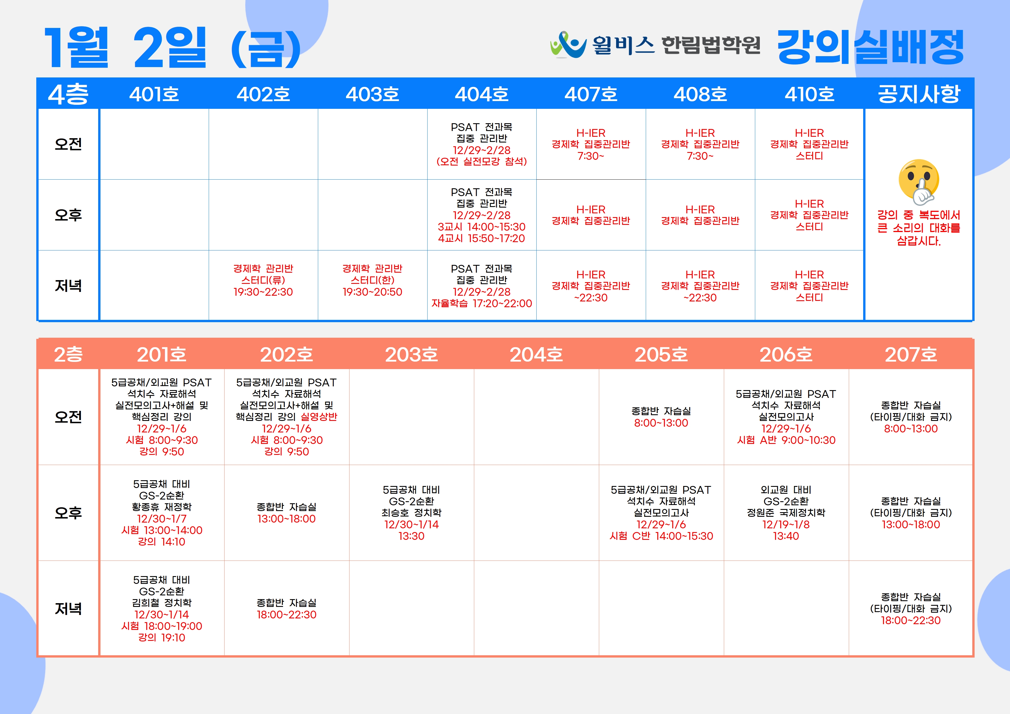 1월 2일(금) 강의실 배정표