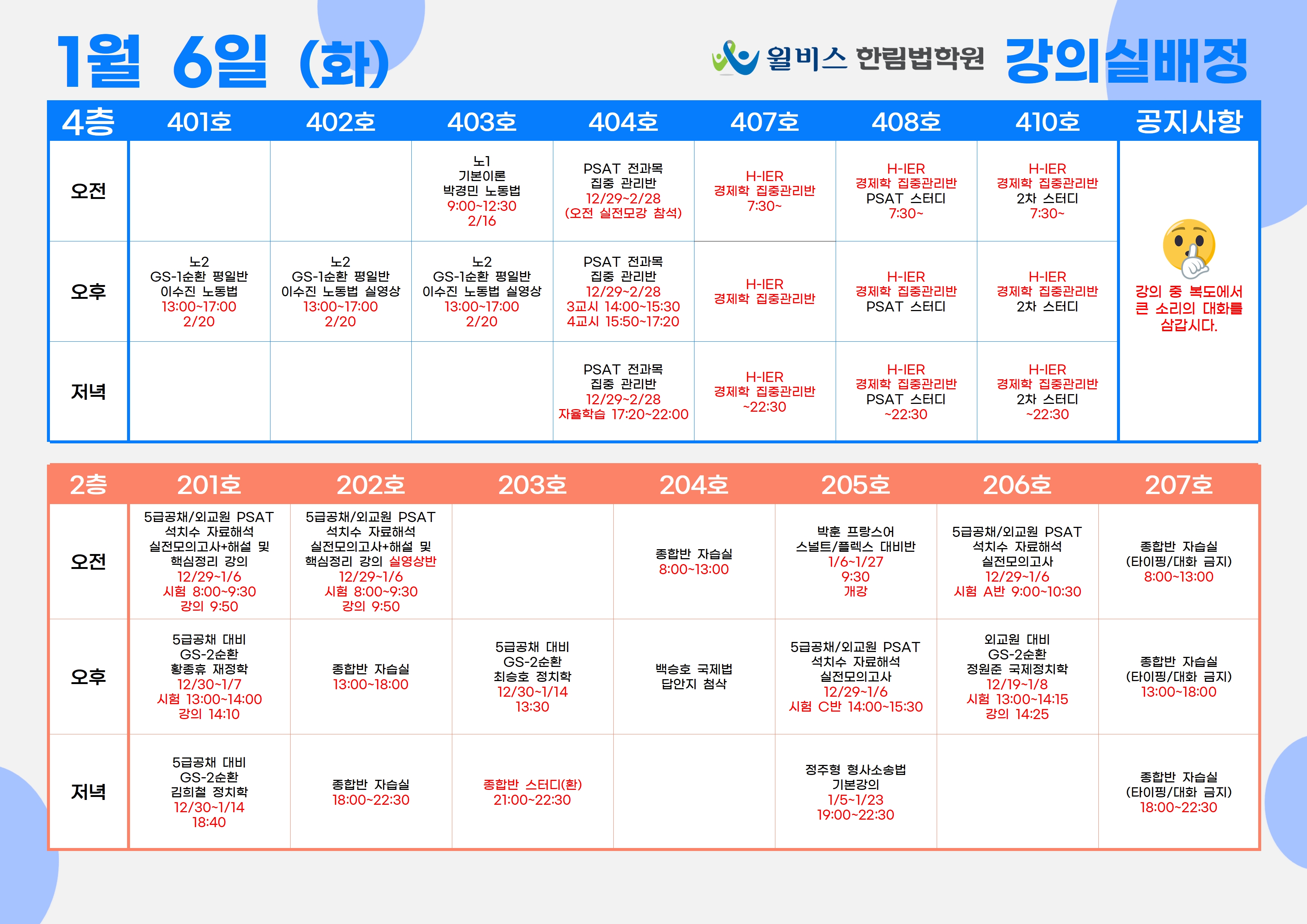 1월 6일(화) 강의실 배정표