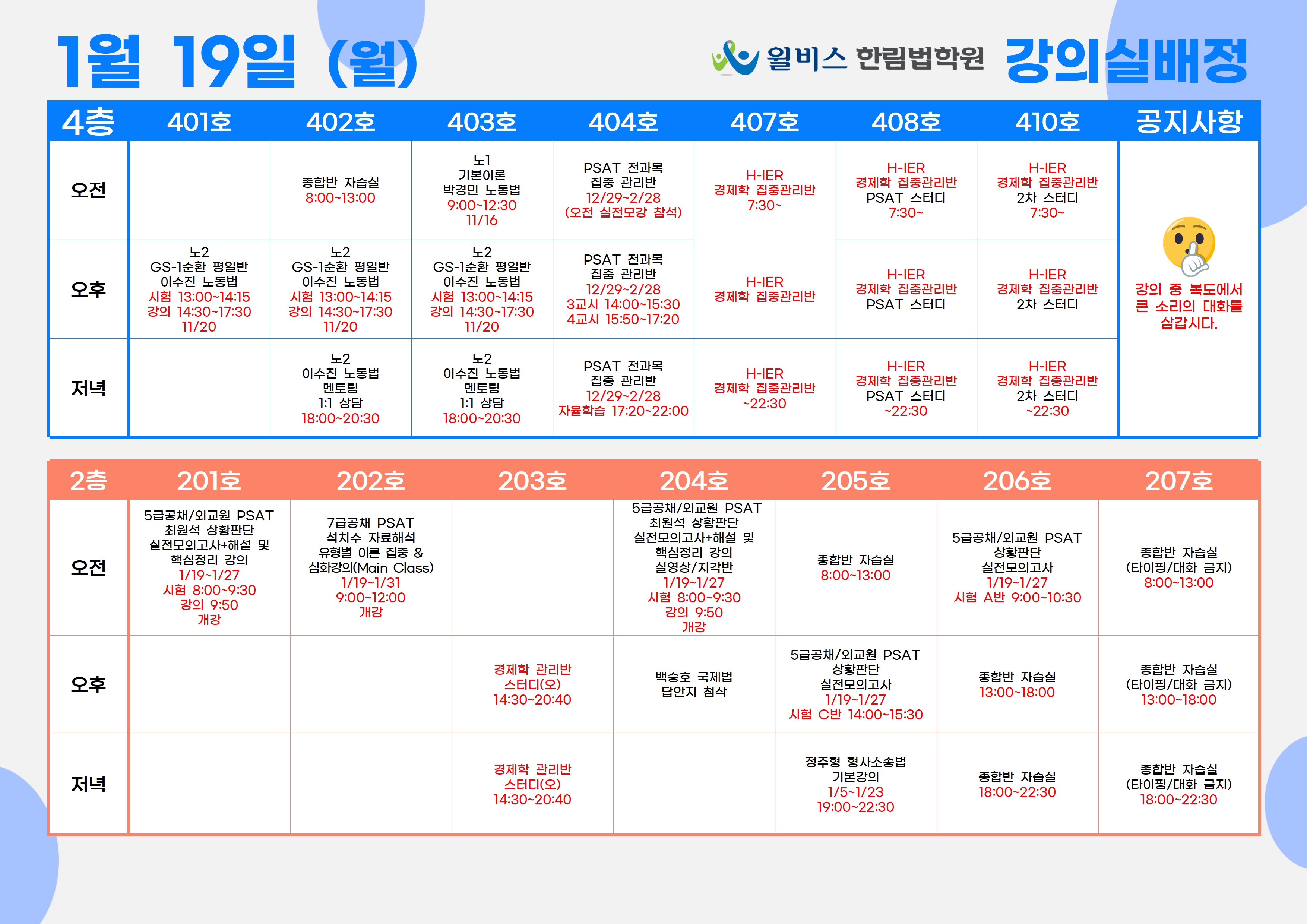 1월 19일(월) 강의실 배정표
