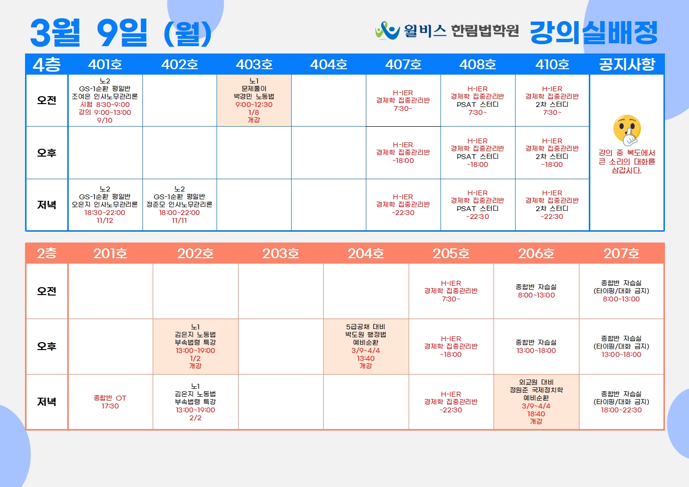 3월 9일(월) 강의실 배정표