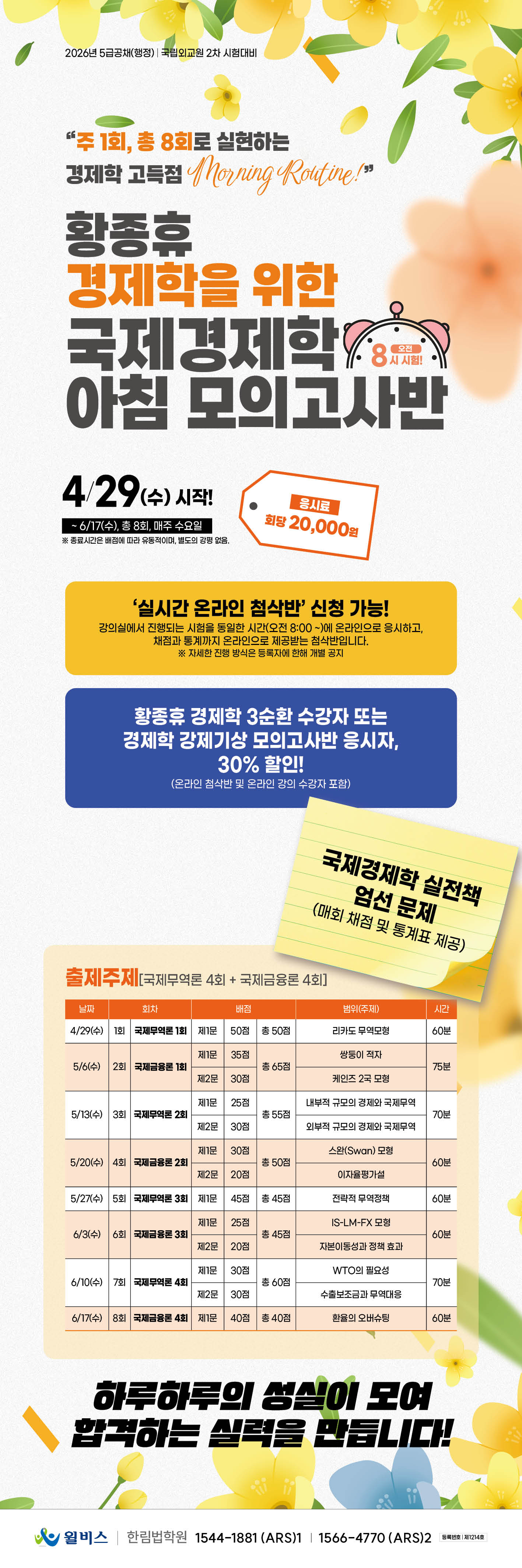 [2026년대비] 황종휴 경제학을 위한 국제경제학 아침 모의고사(4/29,수_개강)